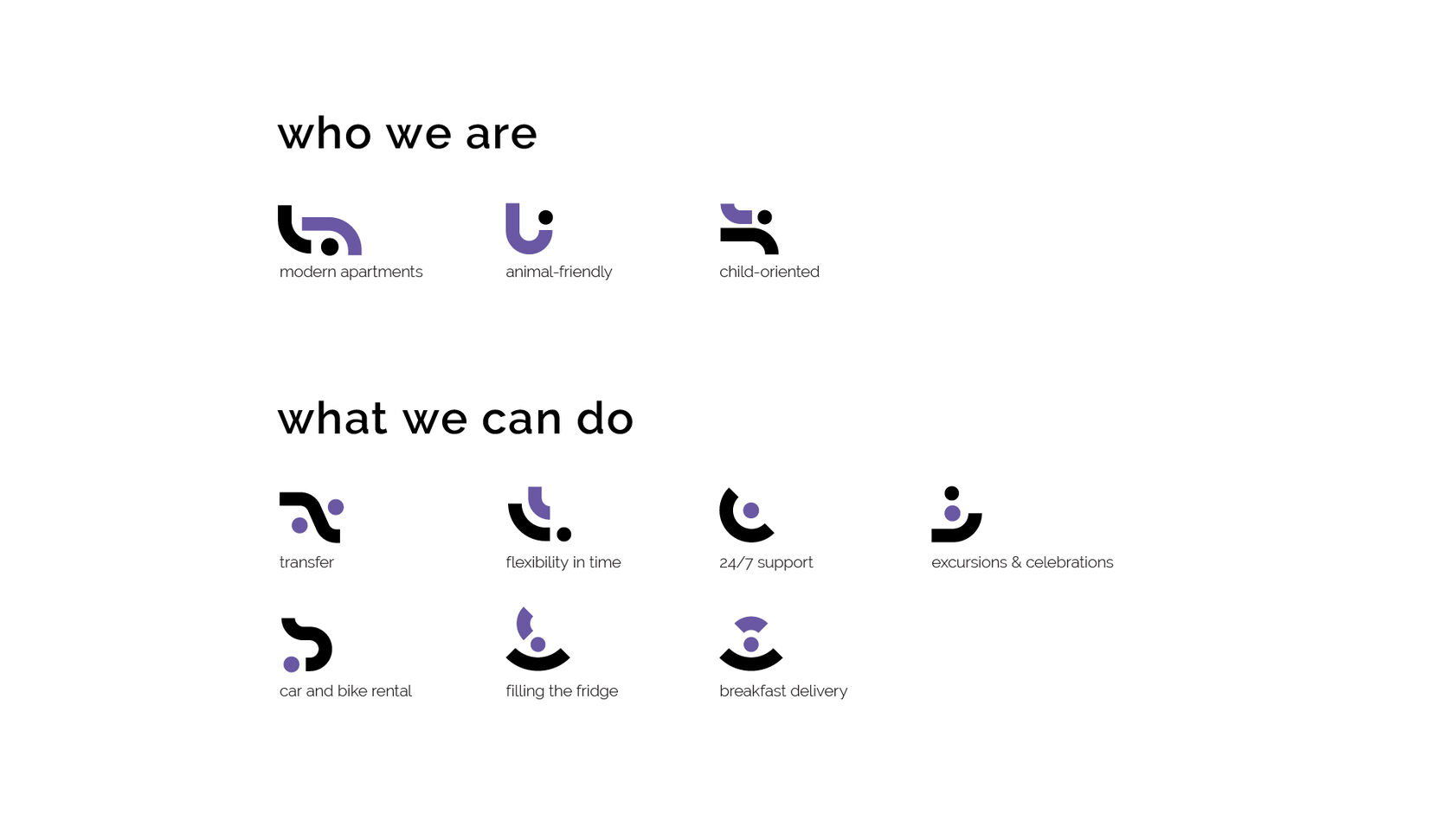 Для найкращої комунікації бренду ми створили яскравий слоган: «Більше ніж апартаменти, комфортніше ніж готель». Більше, тому що можна обрати будь-який район неподалік центру міста із цілодобовим консьєрж-сервісом. Комфортніше, тому що повноцінні апартаменти краще, ніж звичайний готельний номер.